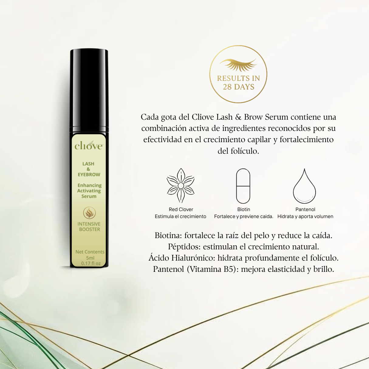 Con ingredientes diseñados para estimular el crecimiento natural de las cejas y pestañas. Combina extracto de trébol rojo, rico en biochanina A —un activo con propiedades calmantes y antiinflamatorias— junto con un péptido biomimético que ayuda a fortalecer el folículo.