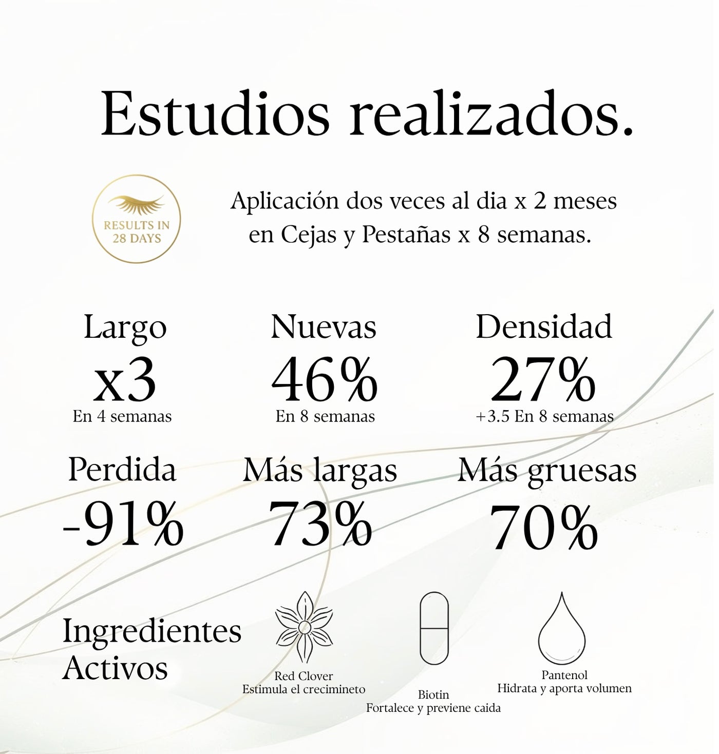 Esta combinación favorece la aparición de nuevos vellos, mejora su firmeza desde la raíz y reduce la caída, logrando cejas y pestañas más largas, densas y saludables con el uso continuo.